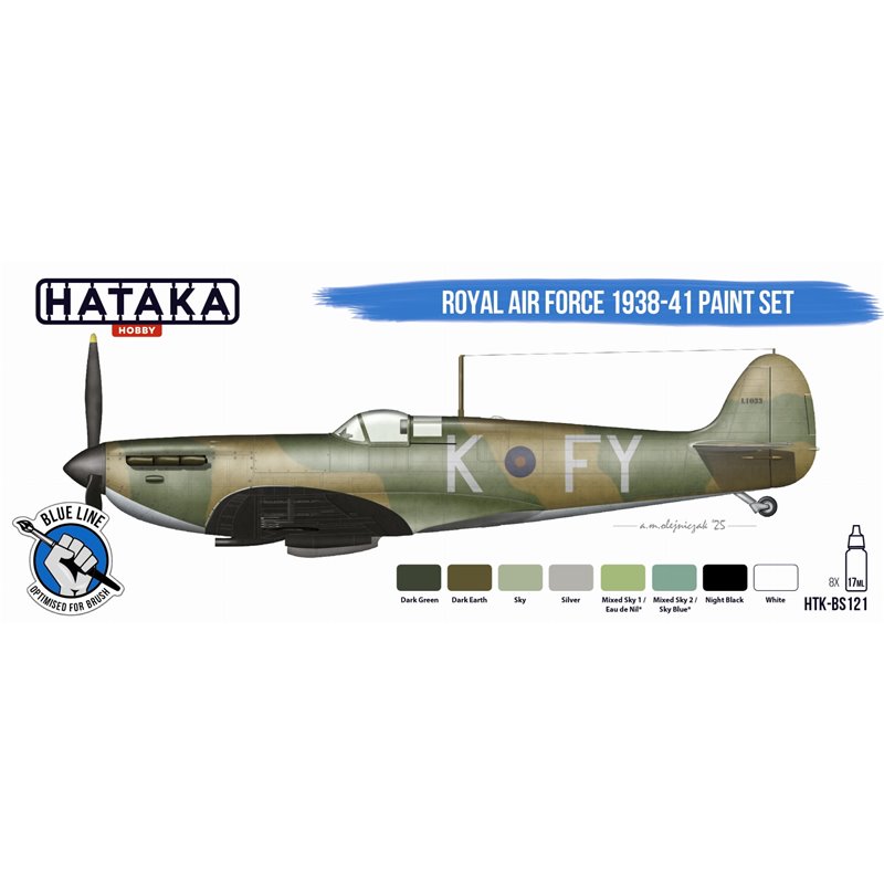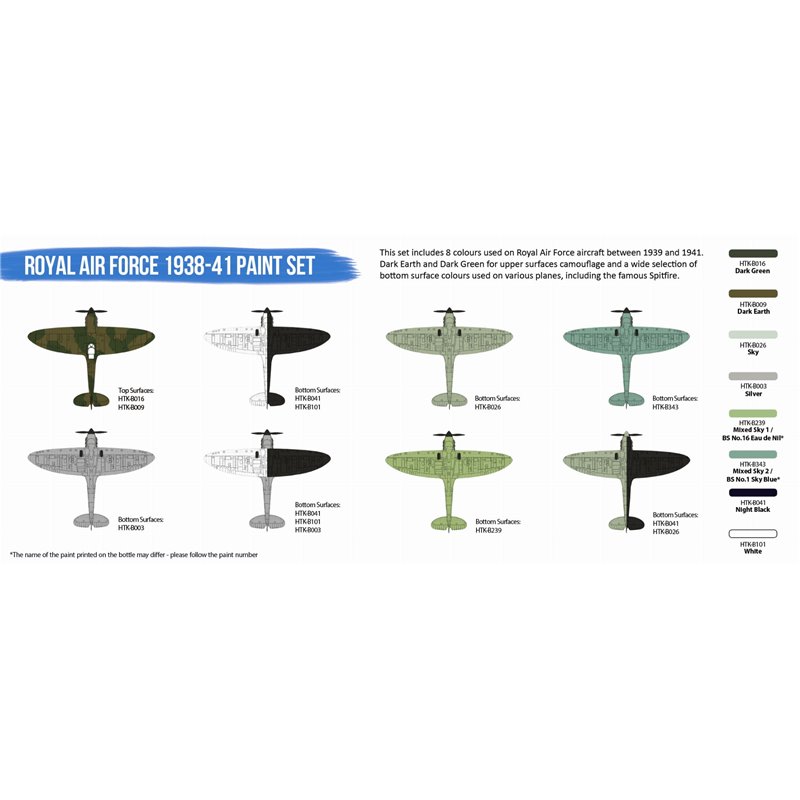 This set includes 8 colours used on Royal Air Force aircraft between 1939 and 1941. Dark Earth and Dark Green for upper surfaces camouflage and a wide selection of bottom surface colours used on various planes, including the famous Spitfire.