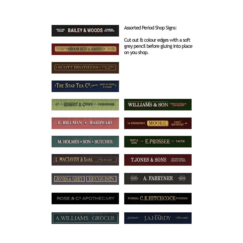 The shop fronts are very easy to assemble from a series of simple layers. Each shop front comes complete with a selection of printed signage for everything from a shoe shop to an ironmongers and can be easily glazed using the cellophane packaging supplied with the kit.
