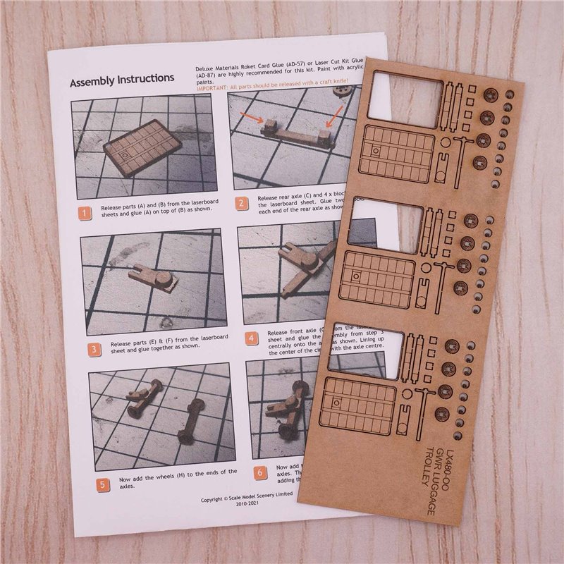 A detailed laser cut kit to build three GWR Luggage Trolleys. Simple to assemble but the kit does contain some very small parts so some experience of building model kits is helpful.