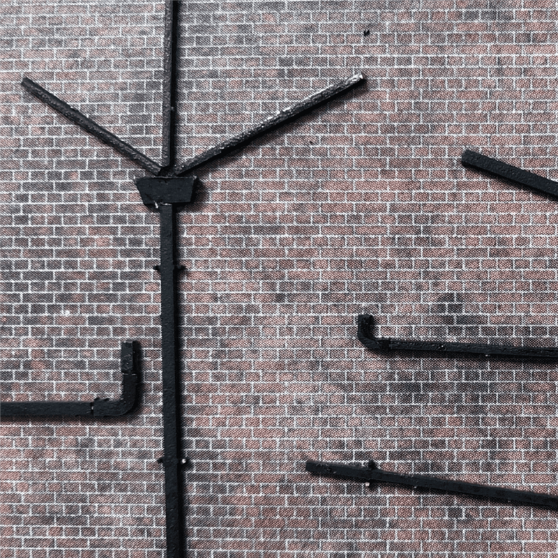 A pack of assorted laser cut downpipes, drainpipes and soil stacks for detailing your OO / 1:76 scale model buildings.