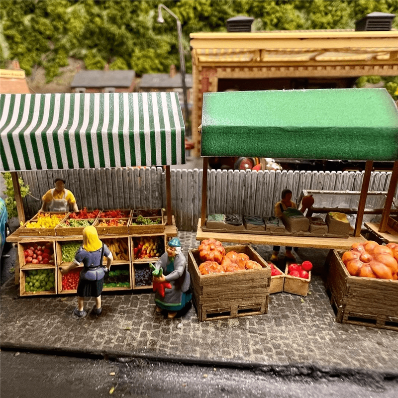 A pack of 4, laser-cut OO Scale traditional wooden style market stalls. Supplied with a choice of canopy designs (solid orange, solid green, green / white stripes) and a selection of assorted produce crates in various configurations. Note: Produce included uses a flat paper texture to simulate filled crates. Empty crate texture also included.