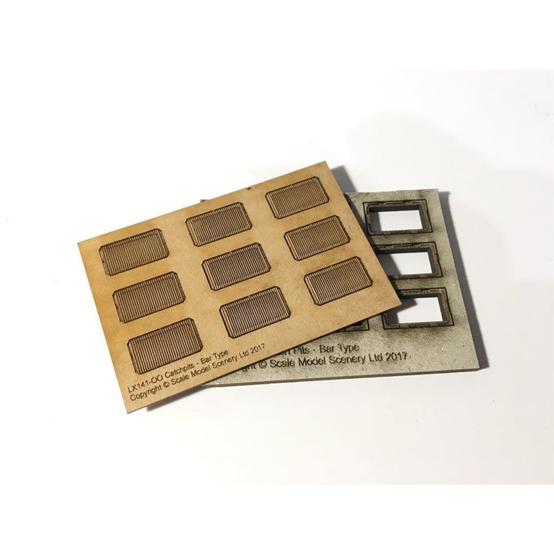 A set of laser cut OO scale trackside Drainage Catchpits (older Bar Type) for detailing any modern image layout. This pack contains 9 catchpits consisting of a concrete pit (grey card) and top bar grid (laserboard). Catchpits are large concrete tanks used as a filter and collector of silt to keep trackside drainage systems running efficiently. They can be found in a wide variety of locations along the sides of the railway network and between the tracks. Designed to be embedded into the ballast along the side of your track. Simply remove from the card sheets, paint the grids, glue together then install into place.