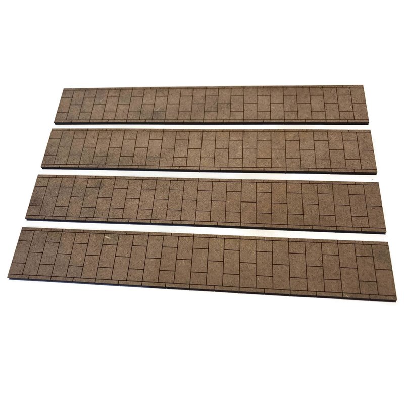 Part of our laser cut basics range, this pack of 4 laser cut MDF straight model railway pavements make a quick and easy way to add realistic pavements to your OO scale model railway layout. Featuring laser engraved 2ft x 3ft slab detail along with 3ft kerbs down each side. Precision cut from 2mm mdf, these give a more realistic appearance when painted, being equivalent to 6" pavement height.