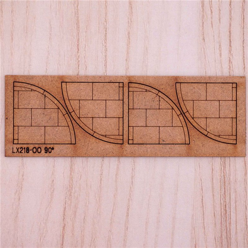 Part of our laser cut basics range, this pack of 4 laser cut MDF 90 degree pavement corners are designed to be used with our LX217-OO Pavement Strips and make a quick and easy way to add realistic pavements to your OO scale model railway layout. Featuring laser engraved 2ft x 3ft slab detail along with 3ft kerbs down each side. Precision cut from 2mm mdf, these give a more realistic appearance when painted, being equivalent to 6" pavement height. There are 4 corners in each pack. Slabs are laid using the "Run Out" corner pattern popular on utilitarian pathways, requiring a less decorative finish.