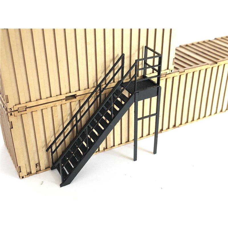 A pack of 2 laser cut & engraved industrial steel type staircases for use with portacabins, shipping containers or as fire escapes. Ideal for detailing a depot, construction site, industrial building or factory.