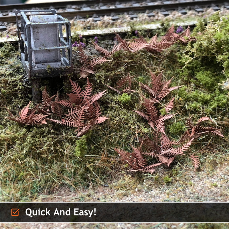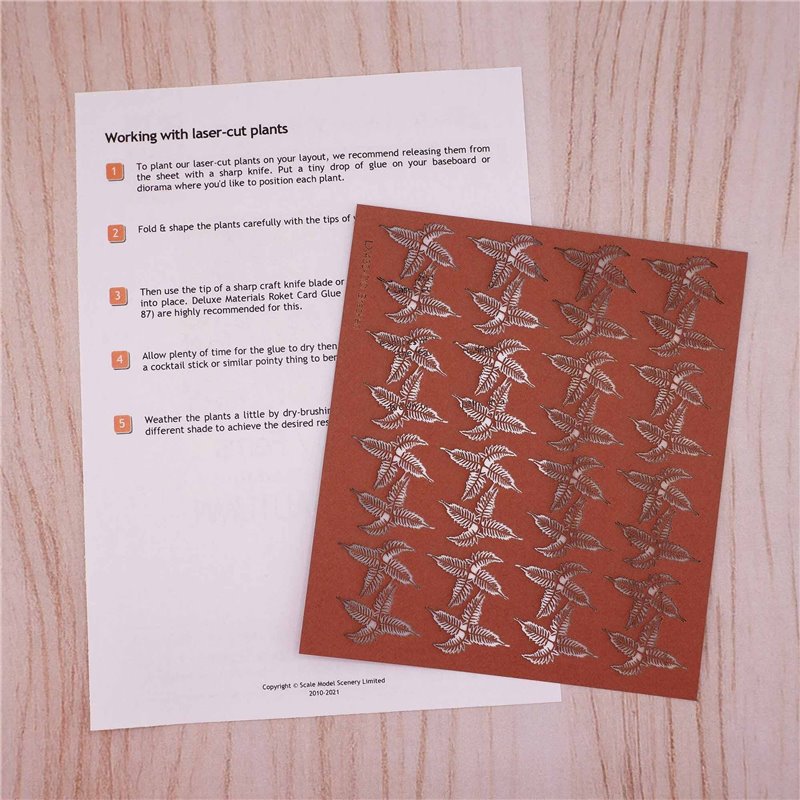 Finely detailed laser-cut model railway fern / bracken plants to add that extra finishing touch to your embankments, hedges, verges & woodland areas on model railway layouts and 1/76 scale dioramas.