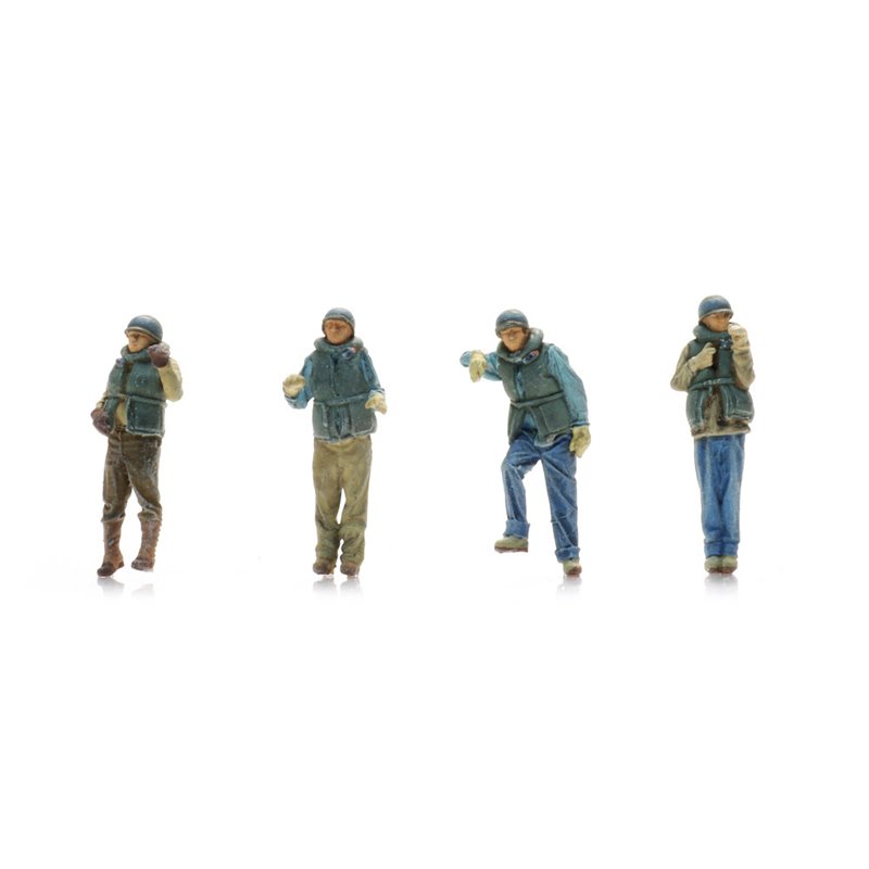 A set of four (4) hand-painted resin figures of US Military Landing Craft Vehicle Personnel. Shown wearing combat fatigues, life jackets and helmets. In various poses and ready to add to your military or railway layout or diorama.