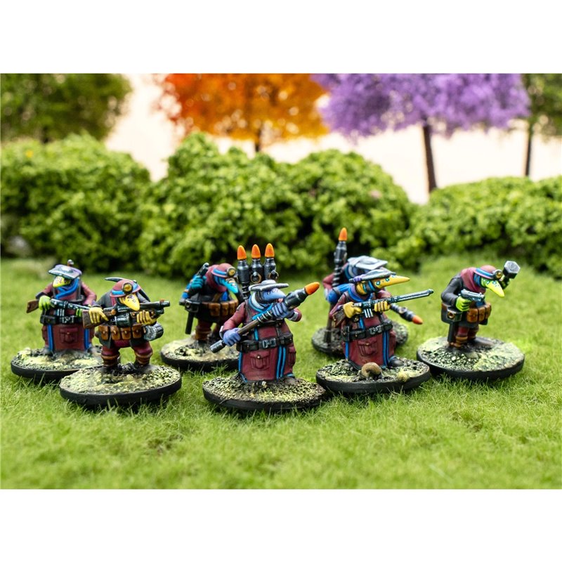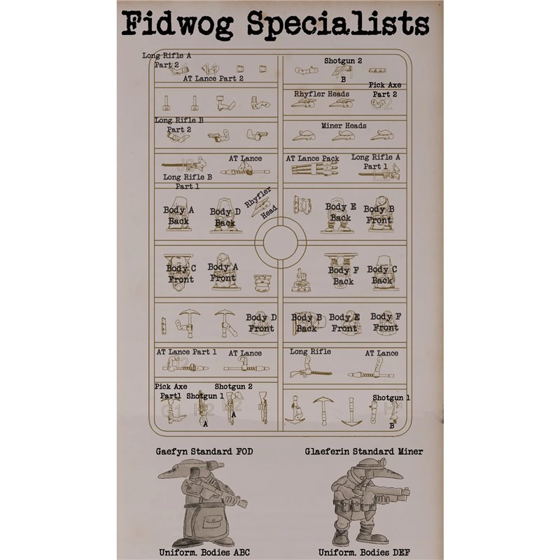 This hard-plastic box set includes enough parts to build 12 Fidwog Specialists, with options for Lancers, Marksquar, and Miners along with 12 Wargames Atlantic Dual-Use 25mm Bases.
