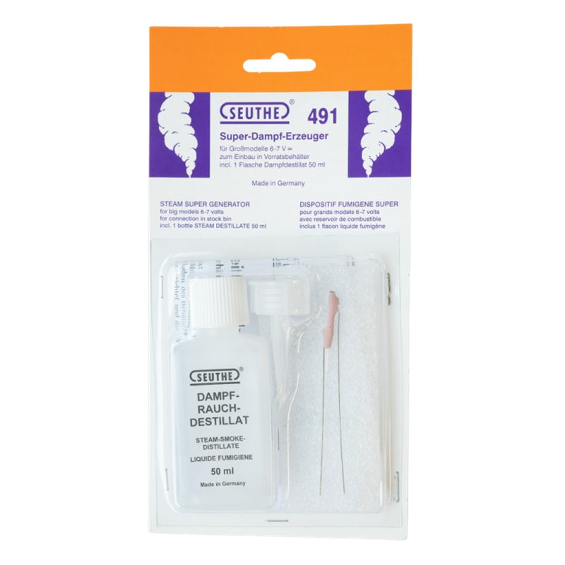 Super steam generator with a power consumption of approx. 800mA at 6-7V operating voltage for installation in storage tanks and with steam, smoke and distillate in a 50ml bottle.