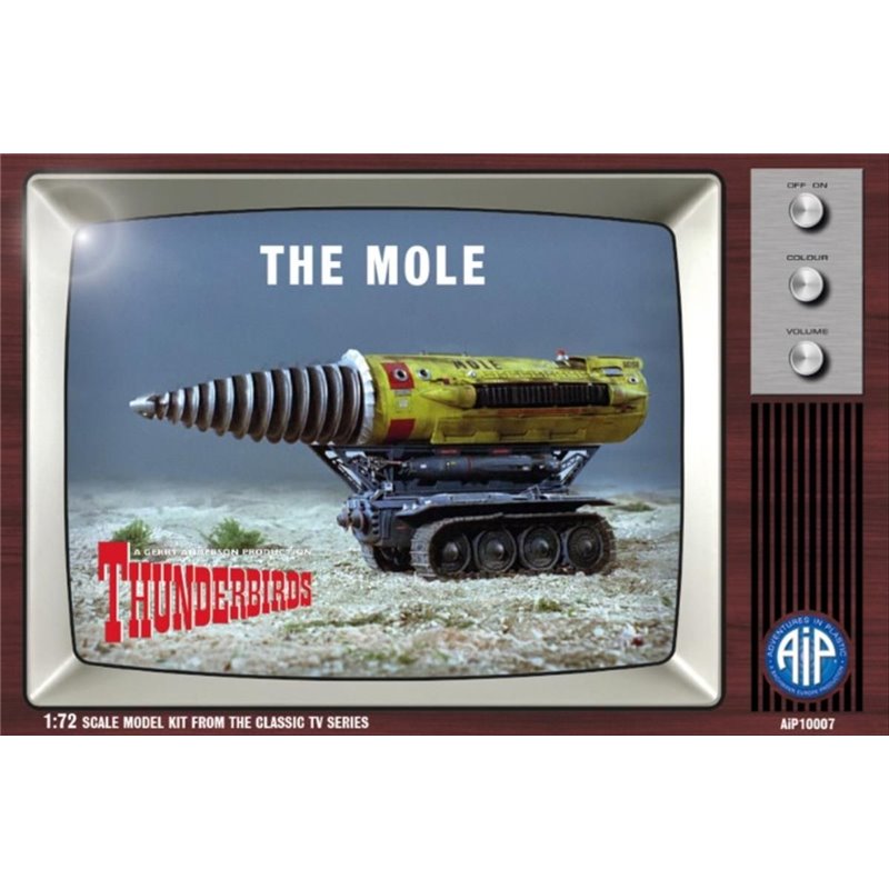 Able to bore through the hardest rock, the Mole is a manned 30 ton tunnelling machine, carried to the rescue site by a caterpillar tracked trolley and is normally transported to the danger zone in Thunderbird 2’s Pod 5. An inbuilt thermal imaging system contained within the Mole’s drill bit ensures that buried individuals are not endangered by rock falls caused by the drill’s movement. The Mole is one of the few pod vehicles to appear in numerous Thunderbirds episodes.