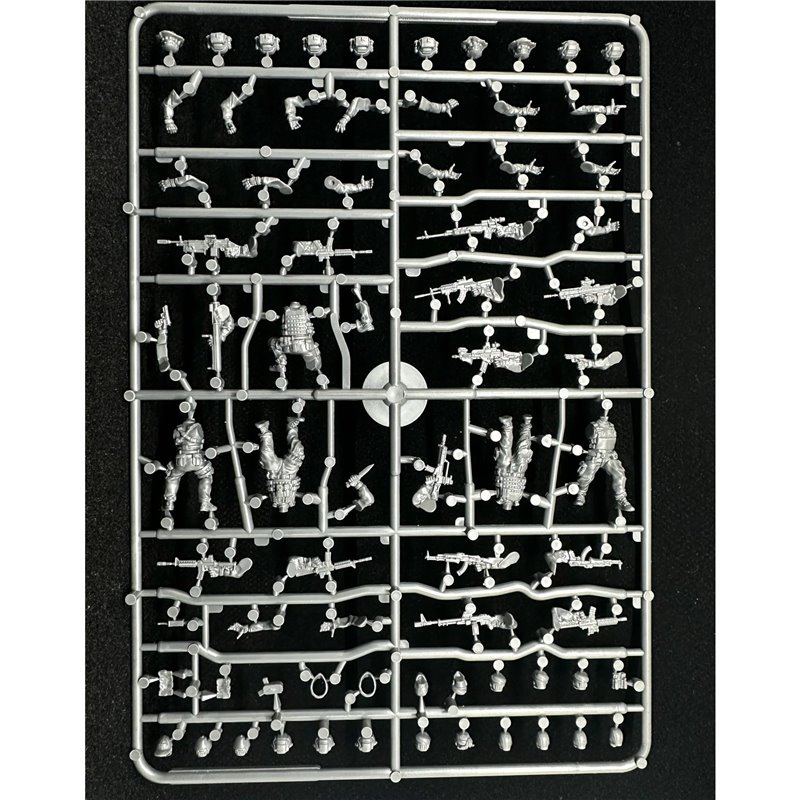 This hard plastic box set includes enough parts to build 20 28mm figures. There are five unique bodies and a mix of modern weaponry including knives, pistols, AR and M-model rifles, AK model rifles, G-model rifles, sniper rifles, light machine-guns/squad automatic rifles, and more! To top it off there are 27 unique heads with a total of 108 heads in the box!