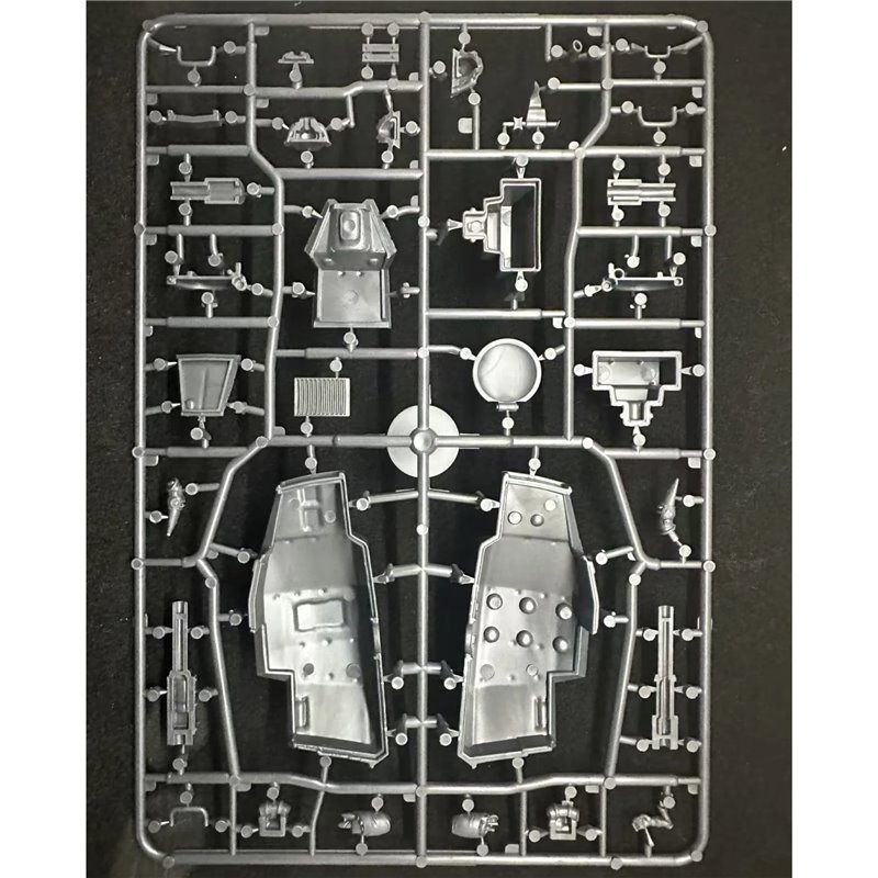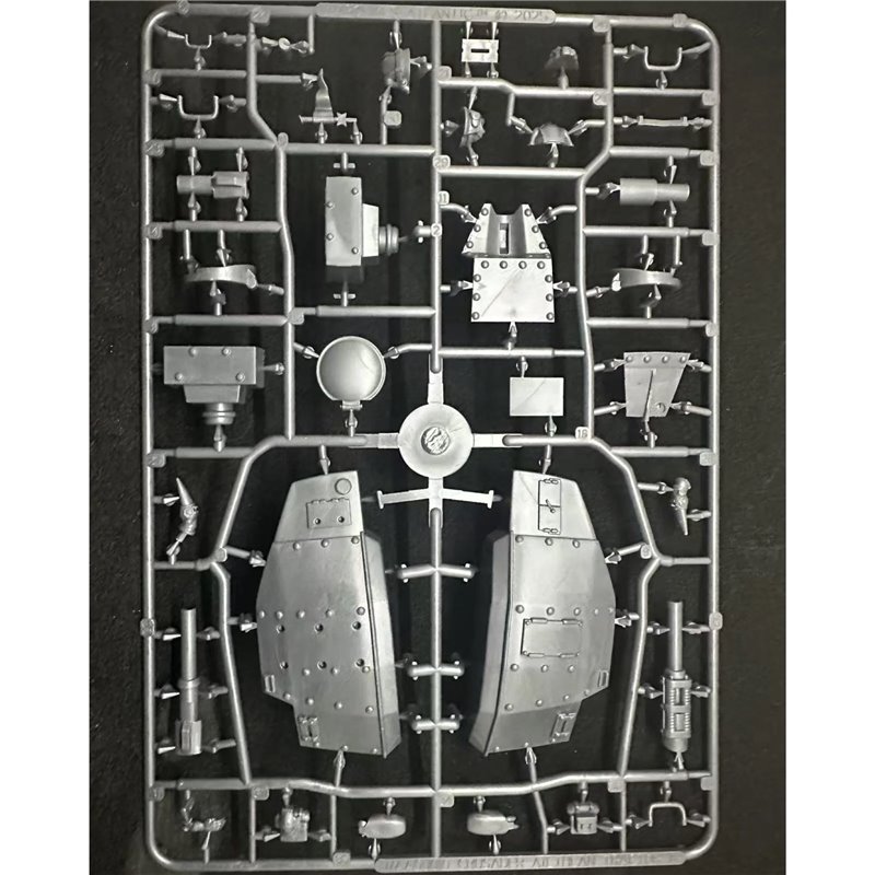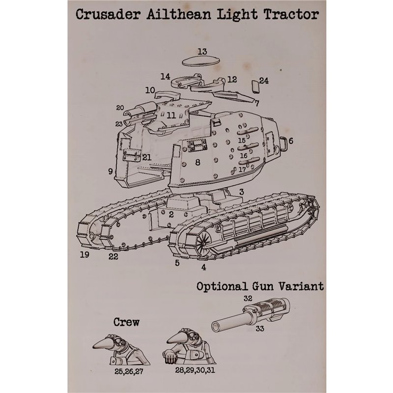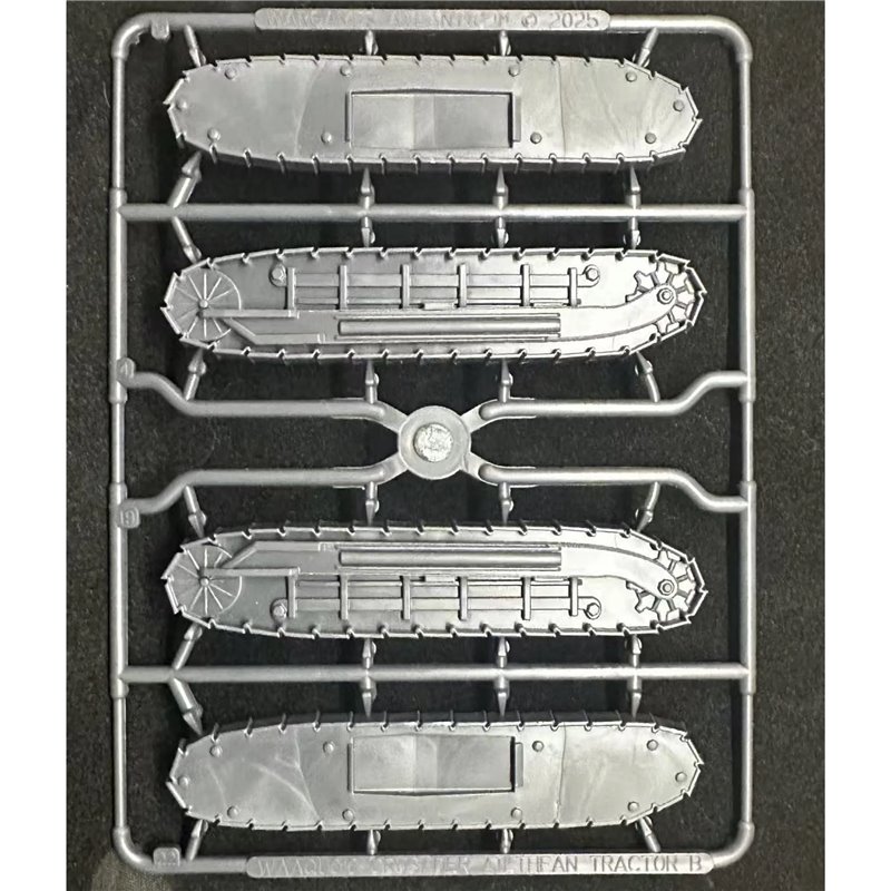This hard plastic box set includes two frames with all the parts to build one Ailthean tractor and crew.