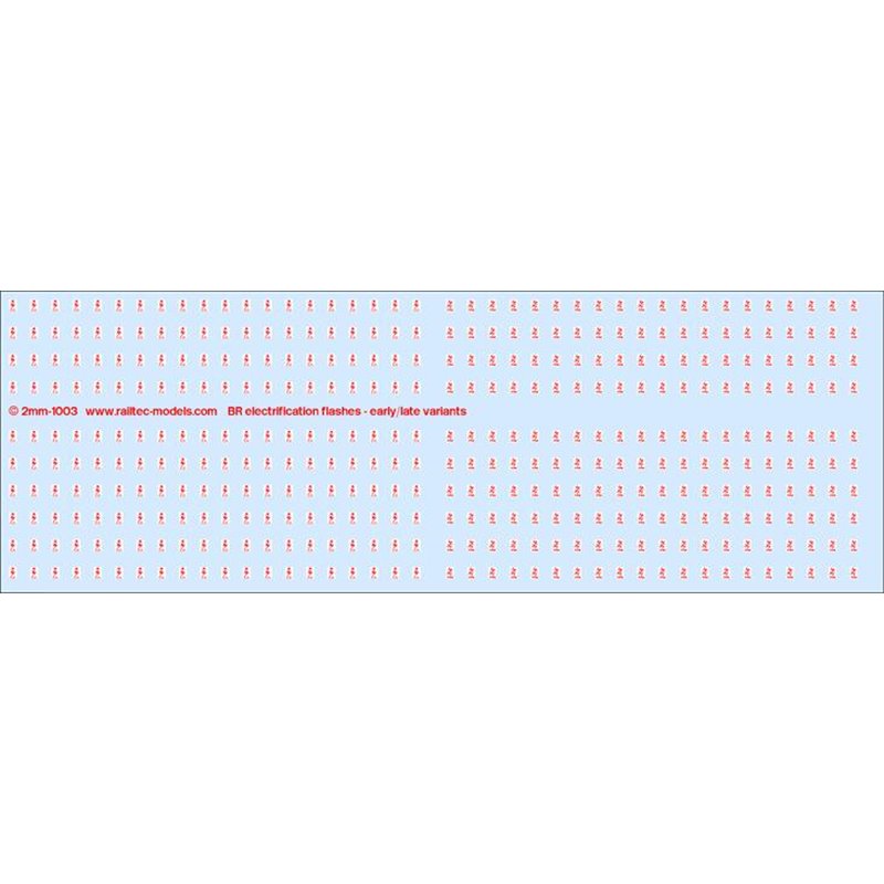 Completely filmless. Includes both early and later variants of electrification OHL flashes. Suitable for locos, coaches, wagons, departmental vans, etc. 200 early flashes & 200 later flashes.