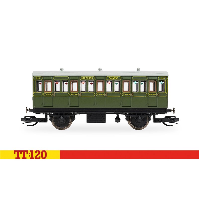 Hornby’s TT:120 SR Third Class Four-Wheel Coach is a beautifully detailed representation of early Southern Railway travel. Finished in authentic SR green livery, this classic four-wheeler features spacious Third Class compartments and distinctive large roof vents, a nod to the gas or oil lamp illumination used in these historic coaches.