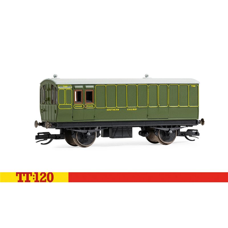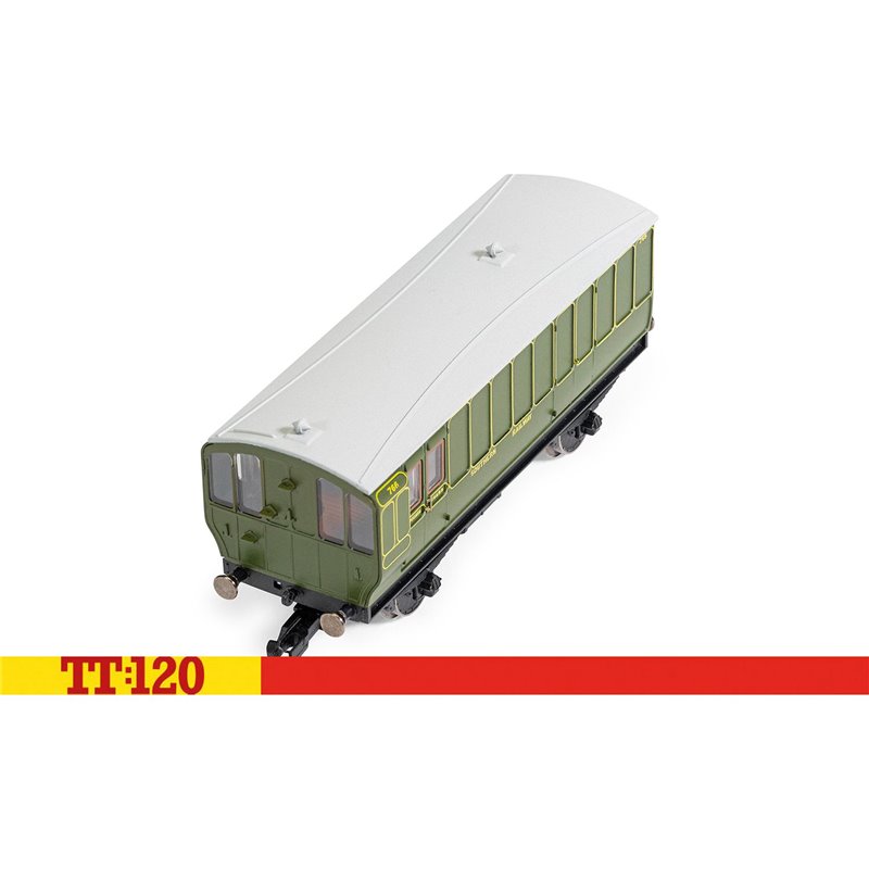 Hornby’s TT:120 SR Third Class Four-Wheel Passenger Brake Coach is finished in authentic SR green and combines Third Class seating with ample luggage space. It also had a dedicated guard’s compartment. Known as a Passenger Brake or Luggage Van, allowing the original coach to play a crucial role in transporting both passengers and their belongings across the network.