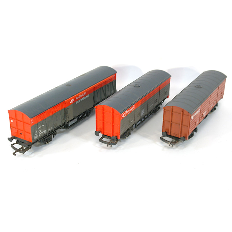 This engine is in excellent condition, with all couplings and buffers present and no major marks or scuffs. It has had a full service and been tested. The three wagons are all Hornby BR Railfreight and in reasonable condition and run well behind the engine