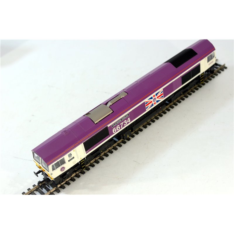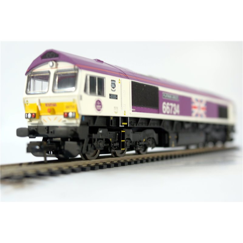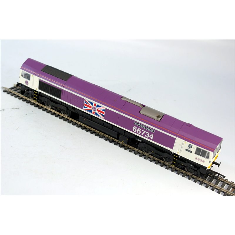 The original 66734 was cut up on site as there were issues with recovering it from the isolated location. On 1st June 2022, ‘Platinum Jubilee’ was outshopped from Arlington Fleet Services in a royal purple and grey livery. The official Jubilee logos were included in the livery and a large Union Jack flag was painted on the bodysides. Vinyl ‘Platinum Jubilee’ nameplates were incorporated.