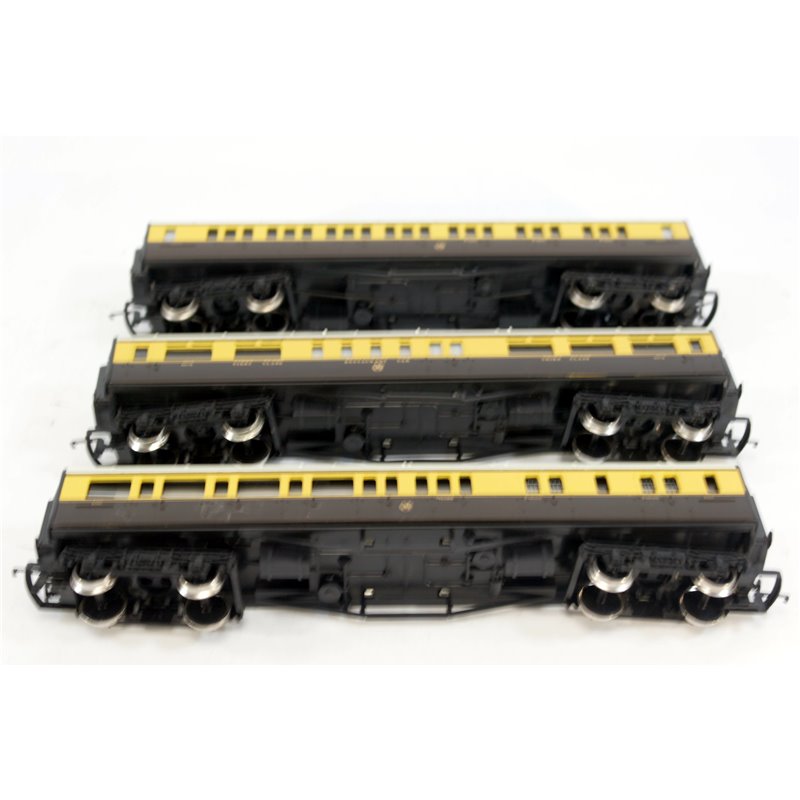 These coaches are in immaculate condition with no evidence of ever being run. all the wheels are clean as new. There are no marks or belmishes at all.