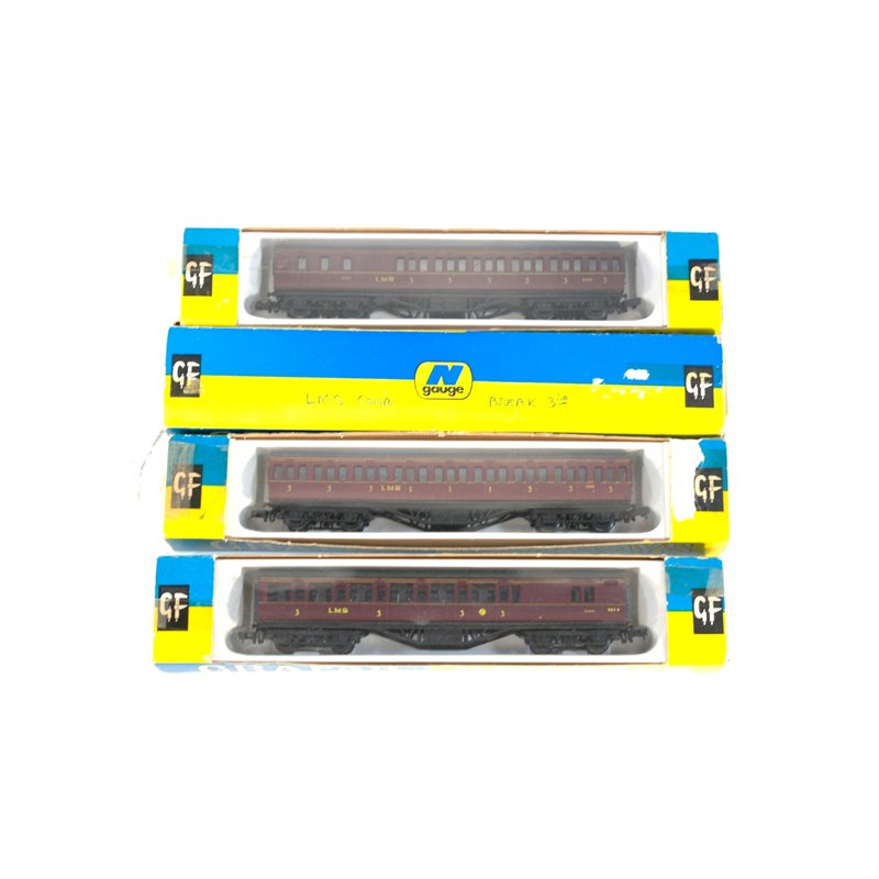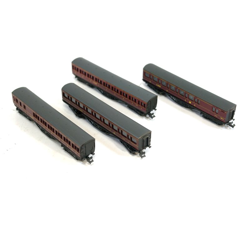 A set of four LMS cri​mson coaches in N Gauge from Grafar.