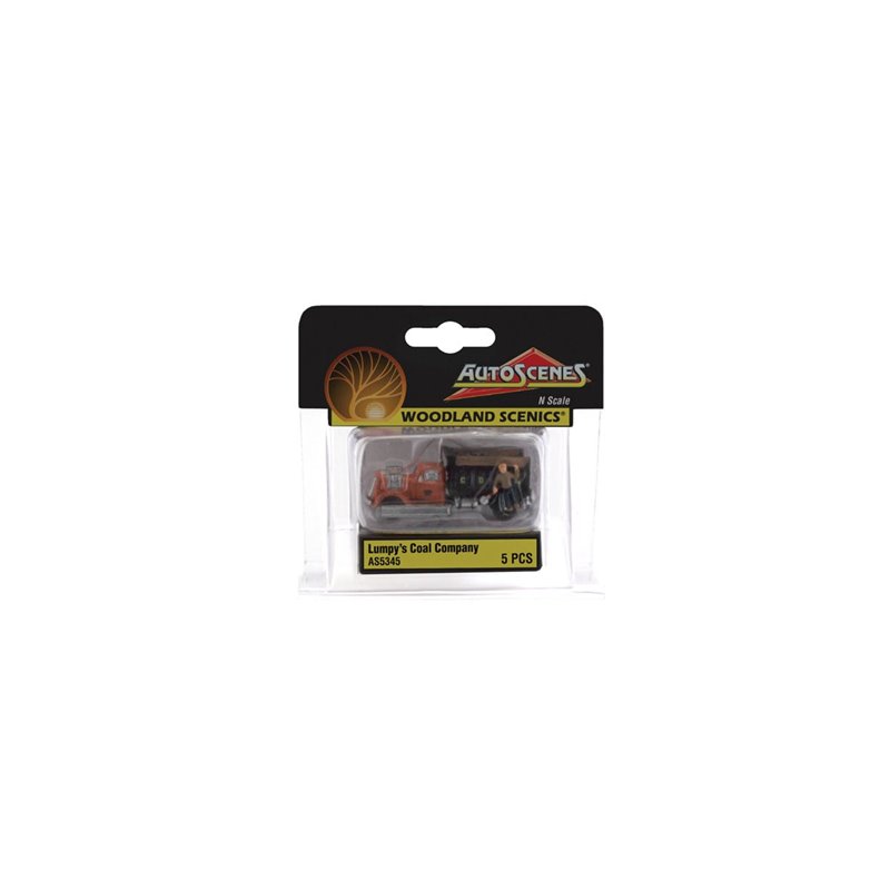 Lumpy prepares to shovel coal from the chute of his vintage delivery truck into a detailed, ready-to-mount coal bin.