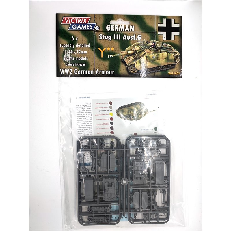 This set includes 6 superbly detailed 12mm/1:144 scale tanks and a decal sheet (German crosses and yellow numbers). The StuG III was a successful assault gun design with a very low silhouette that was armed with a 7.5cm or 10.5cm gun.