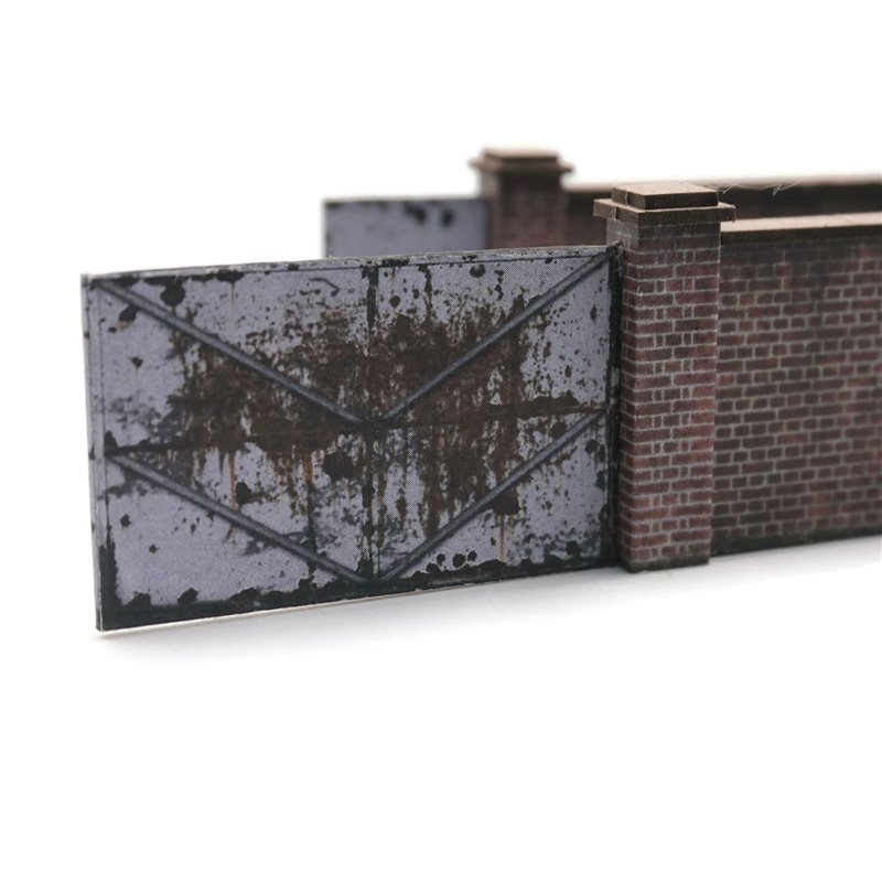 Our KX002-OO 6ft Industrial Brick Wall & Rusty Gates is typical of those seen all around the UK and is perfect for use as a perimeter wall around a factory, along the side of the railway track, or around lorry yards etc on diecast dioramas.