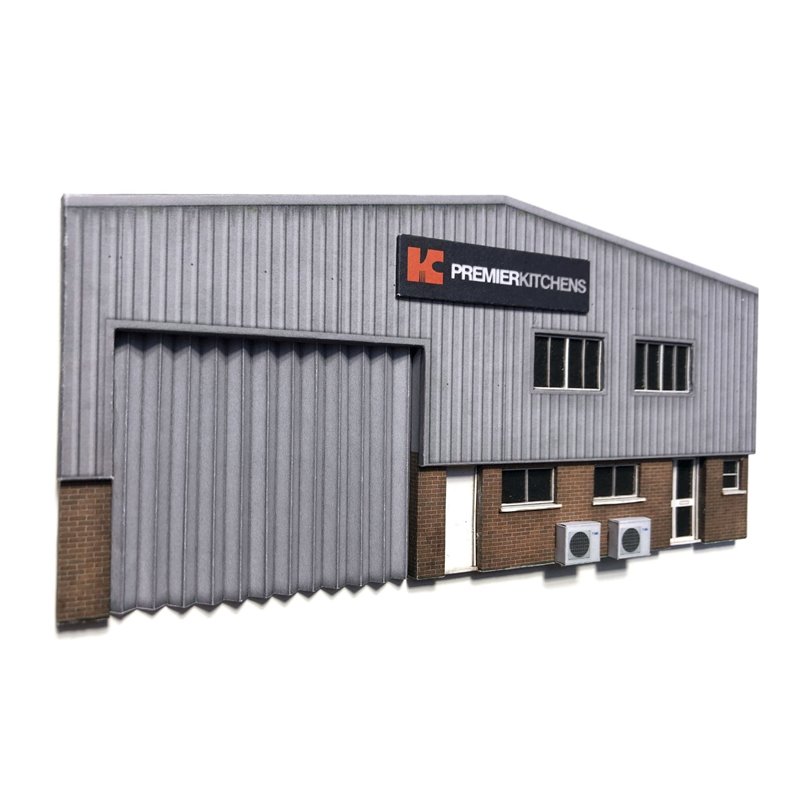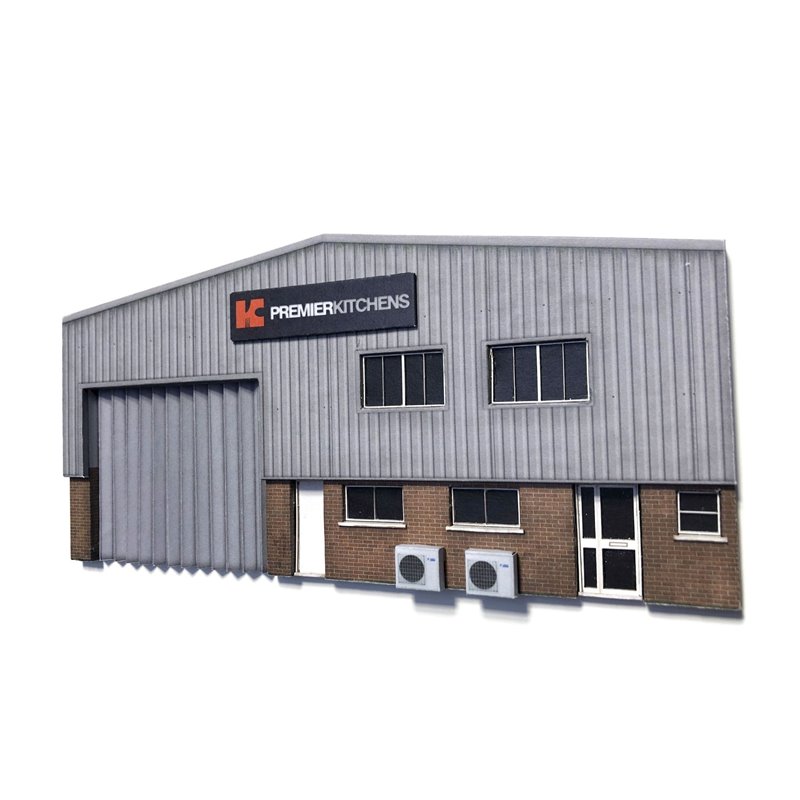 The kit is easy to assemble and uses high resolution, pre-weathered photo-realistic paper texture wraps over a series of MDF layers which leave no unsightly visible when construction is complete. This industrial unit has been designed to take up the minimum space possible up against your backscene, but create maximum impact. At just 7mm deep it takes up virtually no space at all, yet is packed with tons of three dimensional detail including true to scale windows & doors, separately applied air conditioning units, a choice of warehouse door and a selection of company signs too!