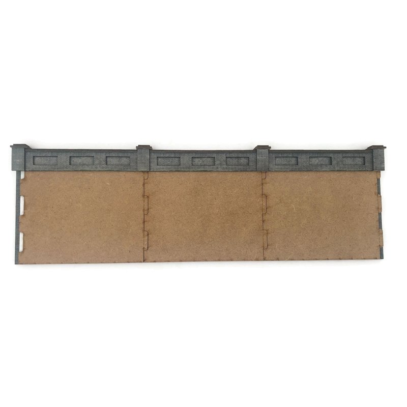 The modules feature laser cut MDF base layers along with greyboard details for the wall coping and buttress tops. The rear of each wall section also features top detail so that the walls can be used up against a raised roadway etc.