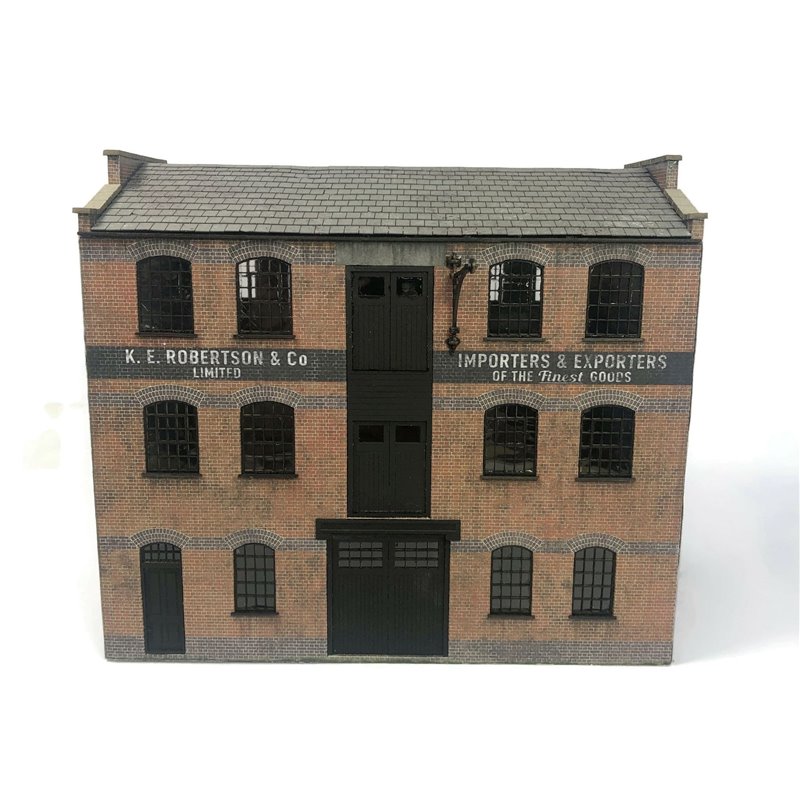 The fully detailed interior features wooden panelling & paintwork to the office walls, white painted interior warehouse walls with weathering, exposed brick patches and general discolouration. The exterior features realistically weathered red brick walls with blue brick banding and arches above the windows. Optional ghost signs, lightly weathered laser cut roof slates and finely detailed wall mounted hoists add that extra finishing touch to make this building the centrepiece of any dockside or industrial scene and are all included with the kit.