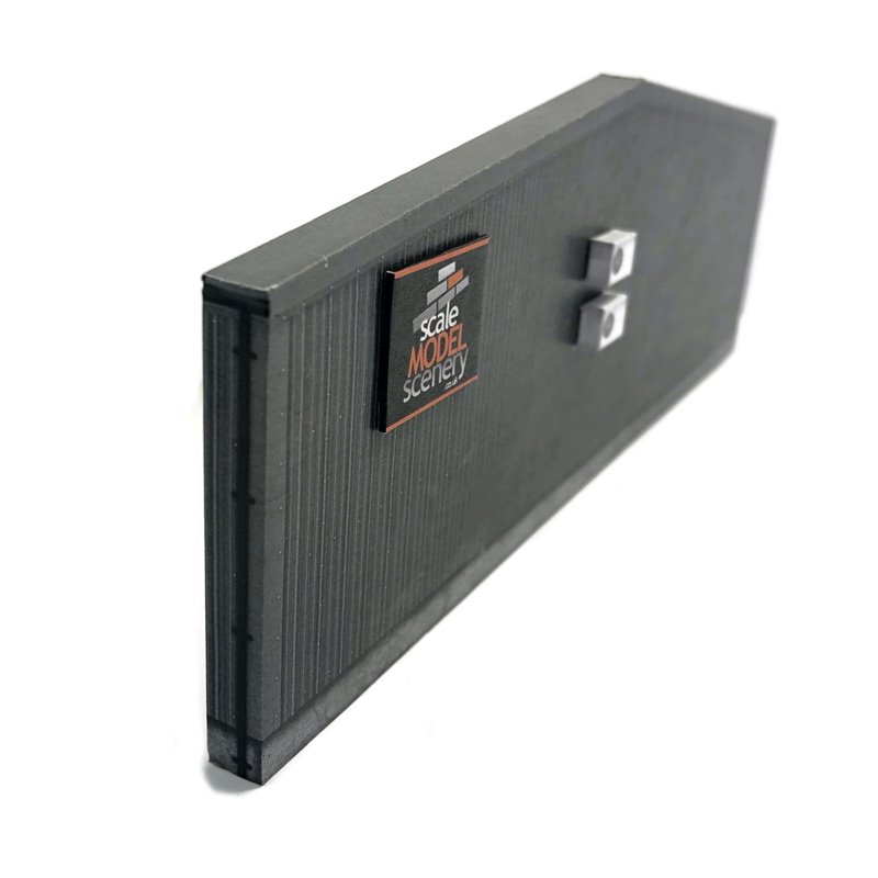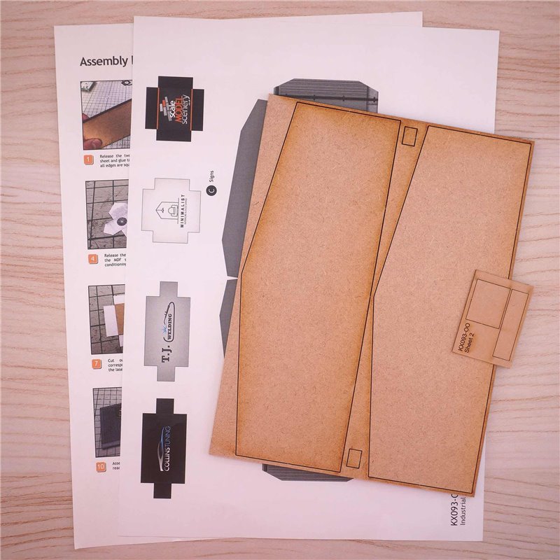 The kit is easy to assemble and uses high resolution, pre-weathered photo-realistic paper texture wraps over a series of MDF layers which leave no unsightly visible when construction is complete. This industrial unit has been designed to take up the minimum space possible up against your backscene, but create maximum impact. At just 8mm deep it takes up virtually no space at all, yet is packed with three dimensional detail including air conditioning units and a choice of professionally designed fictitious company signs too!