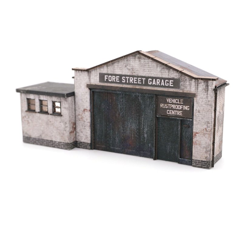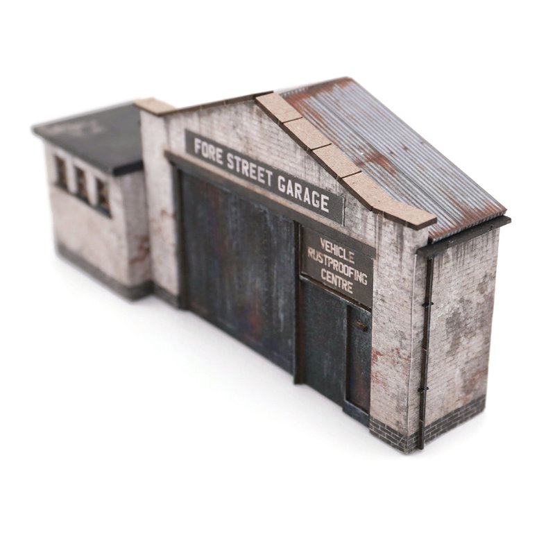 Fore Street Garage is a small yet beautifully detailed, atmospheric & versatile OO gauge / 1:76 scale low-relief backstreet garage building. Based on a real life prototype up in Liverpool, the building features heavily weathered, stretcher bond brickwork (red brick & painted white finishes included) with wooden concertina sliding doors, corrugated iron roof, glazed windows & downspouts. There's also a choice of signage to add addition detail where required.